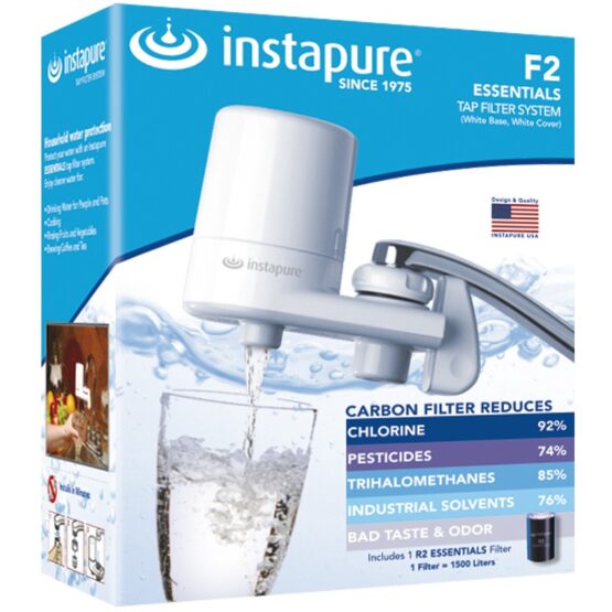 Φίλτρο νερού βρύσης από την Instapure με λευκό κορμό και λευκό καπάκι.